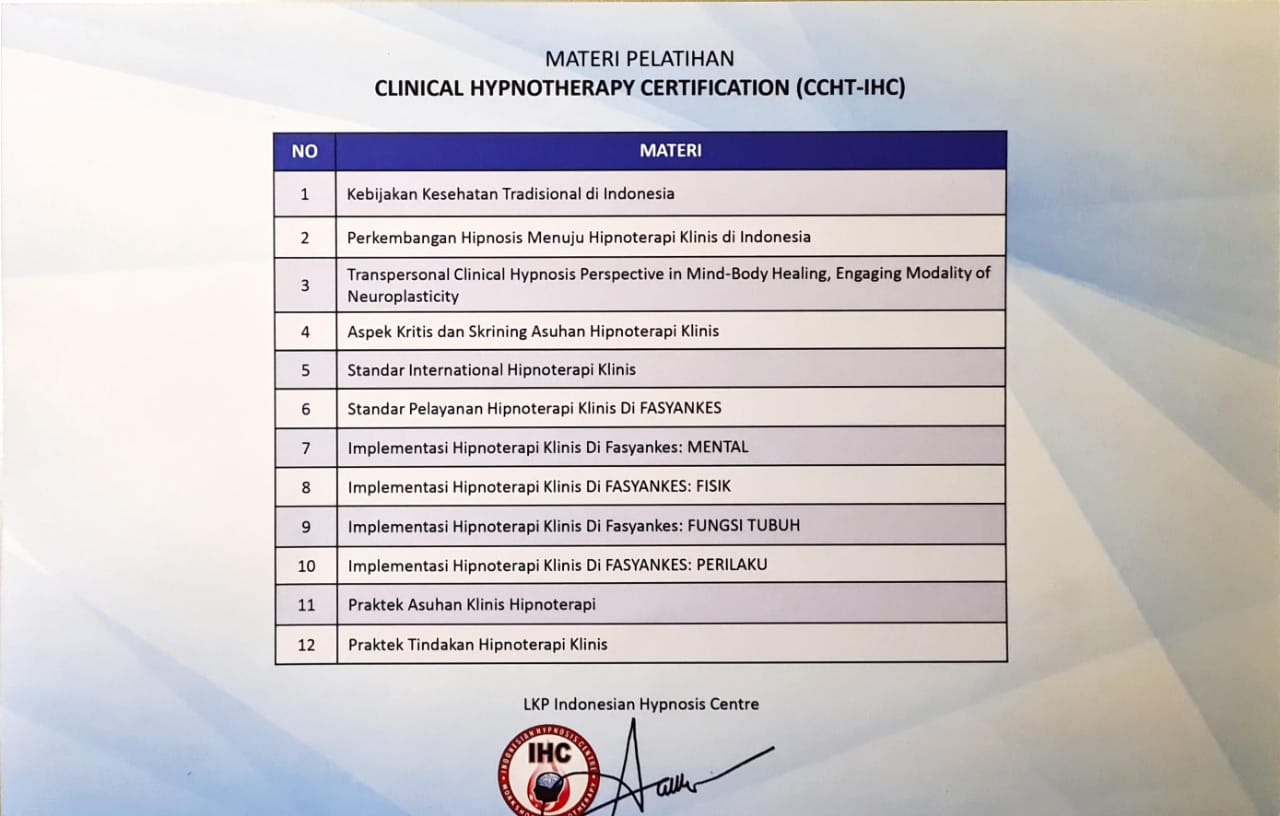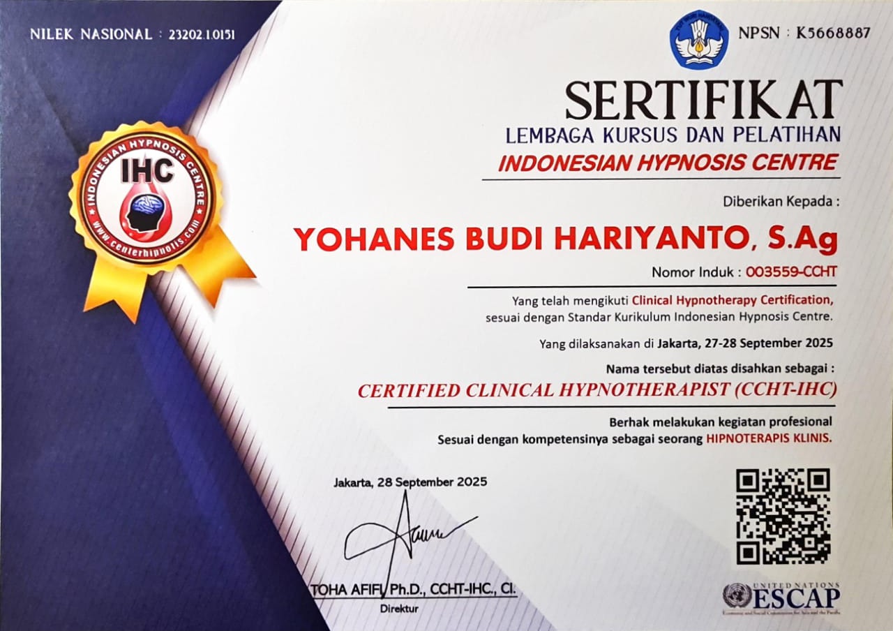 Master Hypnotis Budi juga merupakan praktisi bersertifikat CHt (Certified Hypnotherapist) dan CT-BNSP (Certified Trainer – Badan Nasional Sertifikasi Profesi), yang memastikan bahwa setiap sesi terapi yang dilakukan di ASYA Hypnoterapi memenuhi standar profesionalisme dan efektivitas. Dengan pengalaman dan keterampilan yang mendalam dalam hipnoterapi, Master Hypnosis Budi siap membantu Anda untuk menjalani proses penyembuhan yang mendalam dan menyeluruh.